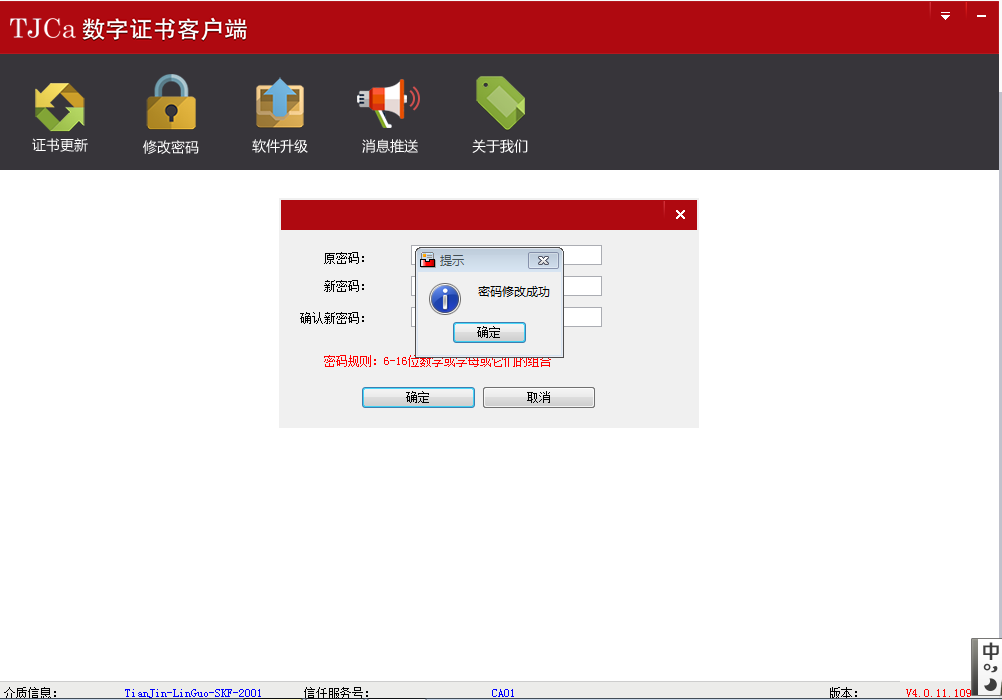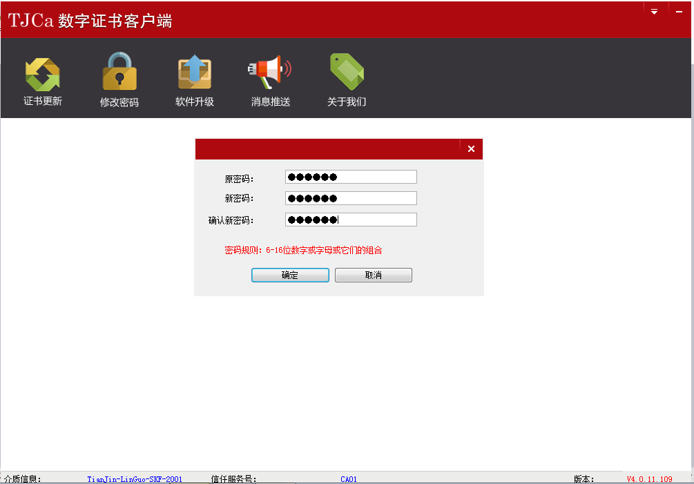 点击修改密码,输入原密码 6个1(111111),输入两遍新密码(密码规则:6-16位的数字字母组合),点击“确定”